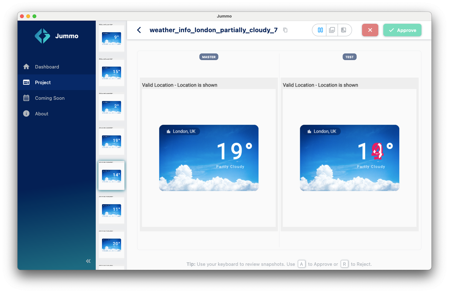 Streamline your development process and review dozens of snapshots by batches, or reject all goldens in a single click